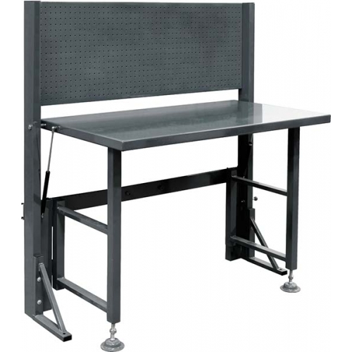 Sklopivi radni stol, praktičan u uskim prostorima, od čelika nosivosti 250 kg. Mogućnos preklapanja radne ploče nošene sa 2 snažna plinska ublaživača (amortizera). Veličina radne ploče 1195x458x20 mm, visina 1.380 mm, a ukupna širina 1280 mm, dubine rasklopljen 648 mm.