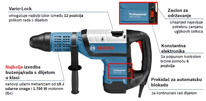 - Niske vibracije - pomoću inteligentnog trostrukog sustava suzbijanja vibracija (postoji i kod GBH 8-45 DV)